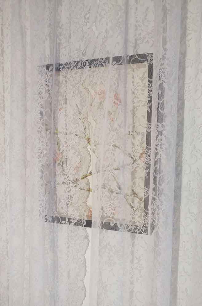 Tissus synthétique, peinture acrylique, tapisserie marouflée sur bois, coquillage, 18 feuilles de papier glacé, faisceau lumineux (projecteur)