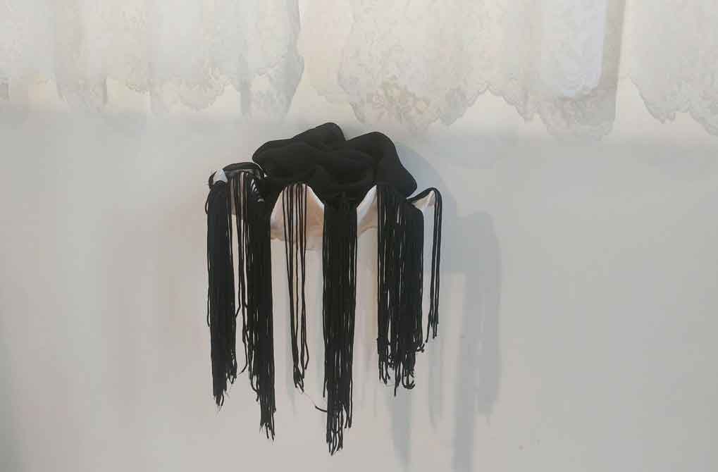 Tissus synthétique, peinture acrylique, tapisserie marouflée sur bois, coquillage, 18 feuilles de papier glacé, faisceau lumineux (projecteur)